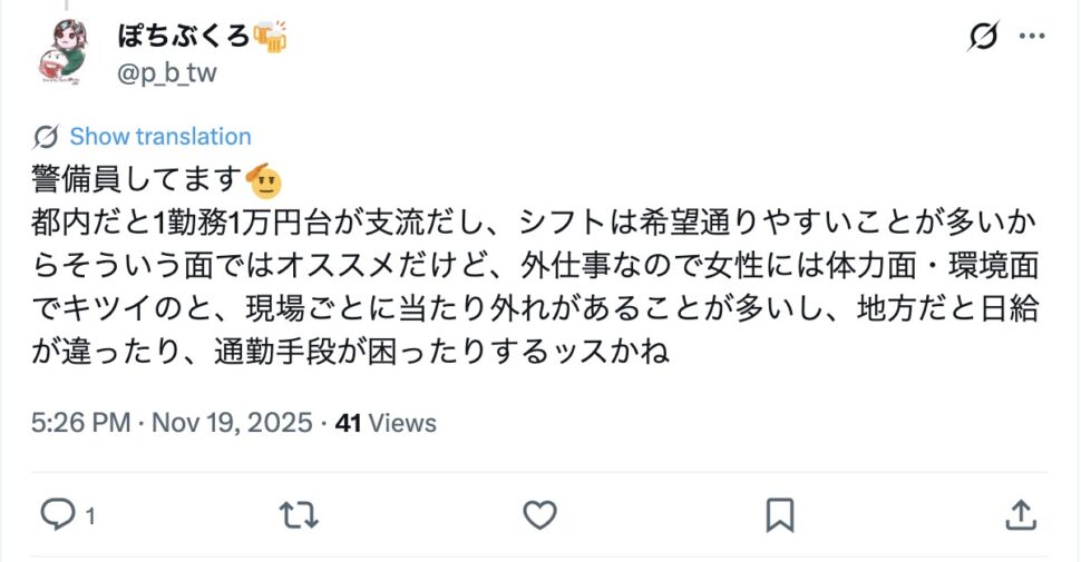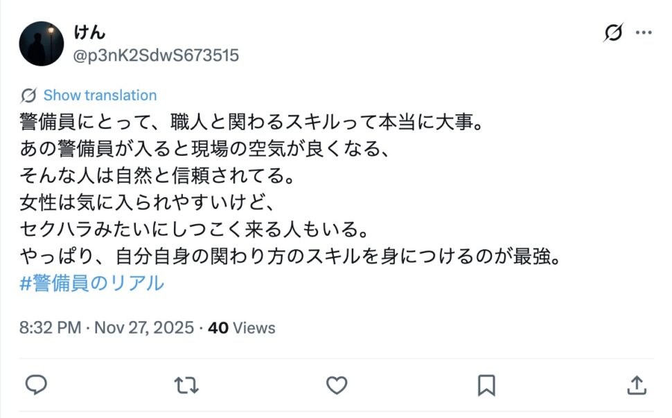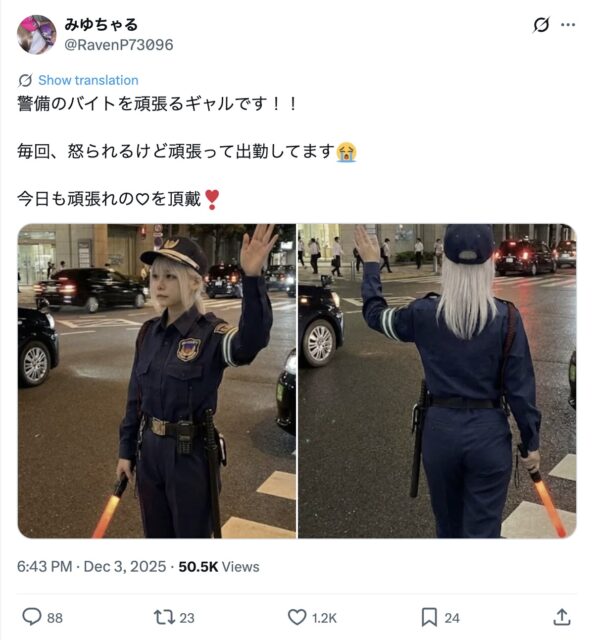 ここでは、SNSに投稿された女性警備員に関する投稿をご紹介します。