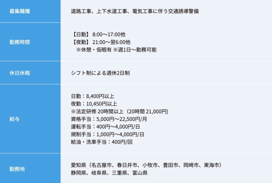 体を動かす仕事が好きな方や、屋外で働くことに抵抗がない方、交通誘導警備の経験を積みたい方にも検討しやすい求人だといえるでしょう。